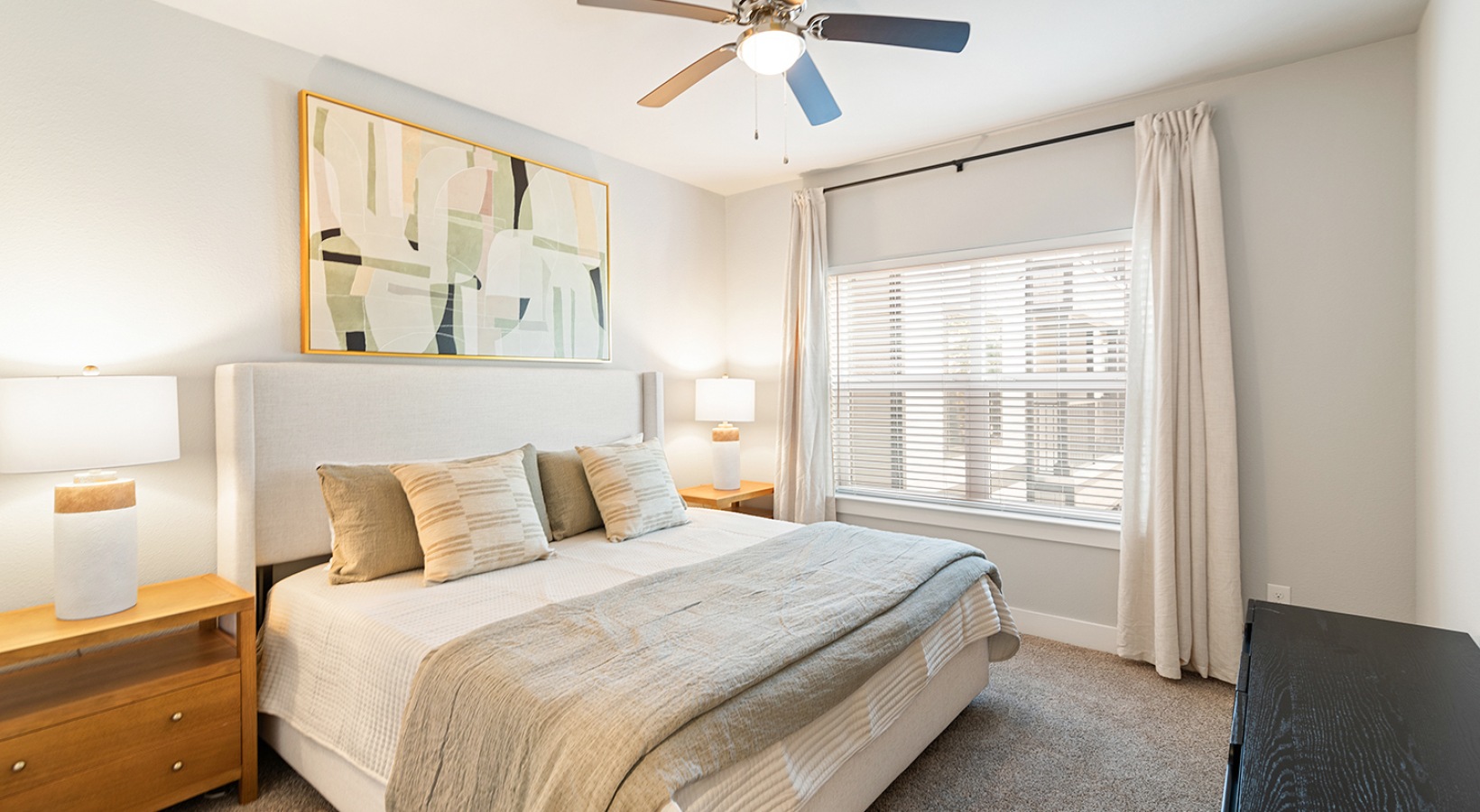 • a bedroom with a large bed, ceiling fan, and window