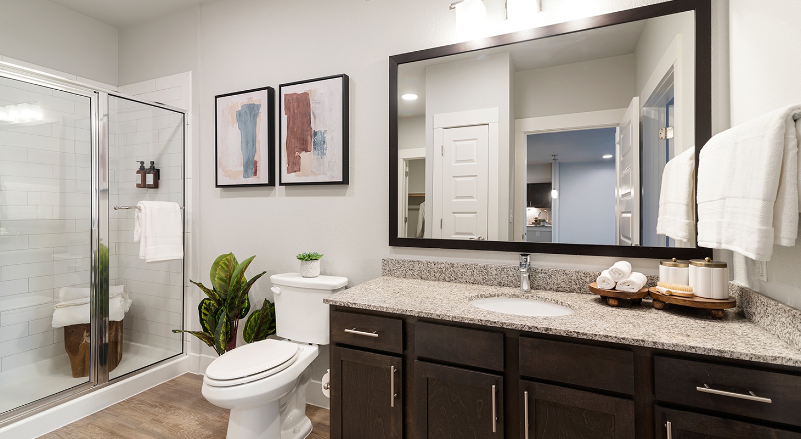 • a bathroom with a large shower and counter
