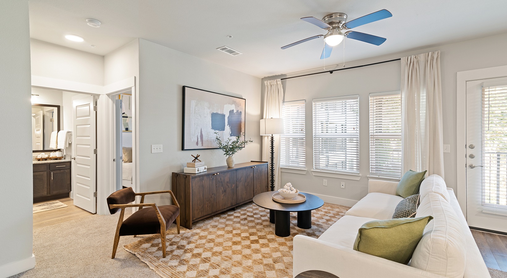 • a living room with large windows and access to a bedroom and bathroom