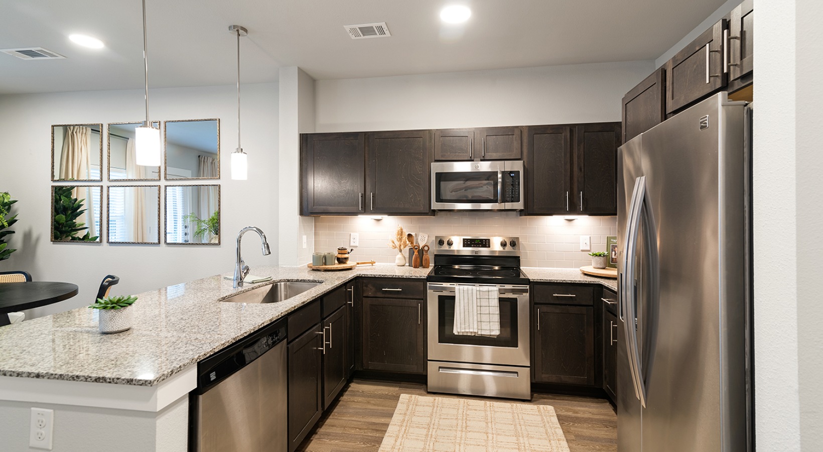 • a kitchen with seating and dark cabinetry