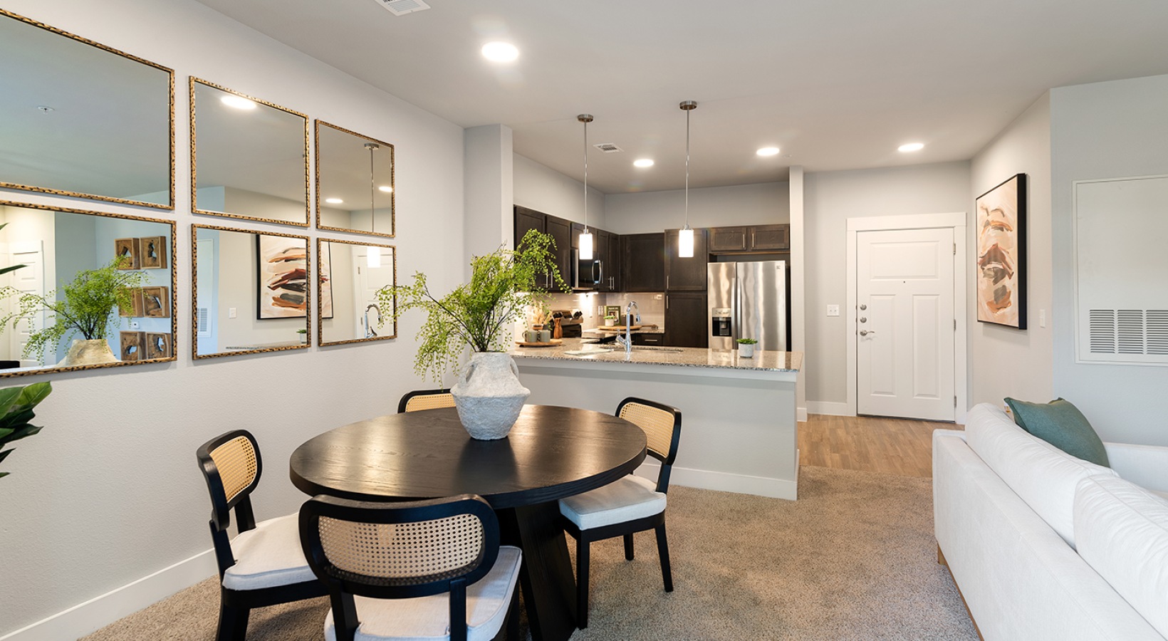 • a dining area next to a kitchen island and couch